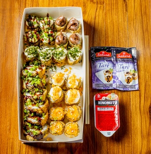 Hot DoritosSalmão empanado e frito com cream cheese e doritos por cima(Medio (4 Unid.)) R$ 20,00 / (Grande (8 Unid.)) R$ 32,00